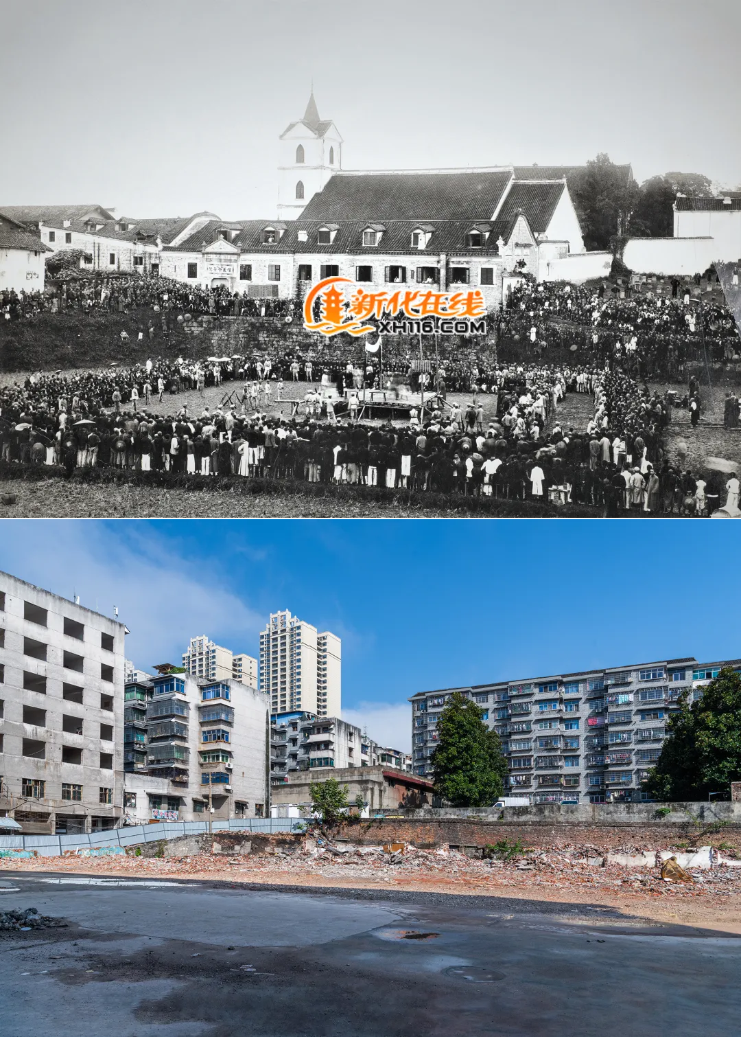 在过去的一百年里,新化历经日新月异的变迁,百年前的田间地头坟山现在已成为闹市区,当年,教堂与坟墓,生与死的两端,在这里相互交织。在世与永生,如同黑夜与白昼,相互交替,构成了这个世界的循环。擂台比武处今夕百年对比,悠悠岁月,沧海桑田,让人感慨万千。2024年国庆期间,建于上世纪七十年代的老人民医院拆除,才能以当年的位置当年的视角勉强拍出当年的场景。我们现在拍摄的照片,再过一百年,将会是一种什么样的方式展示在后人面前?让我们循着这张留存下来的老照片,追溯历史的足迹,寻找那些即将被尘封的往事,细细讲述“挽留彭县长,抵制梅尉南”和“新化首届国术比赛”的波澜壮阔、百年传奇。