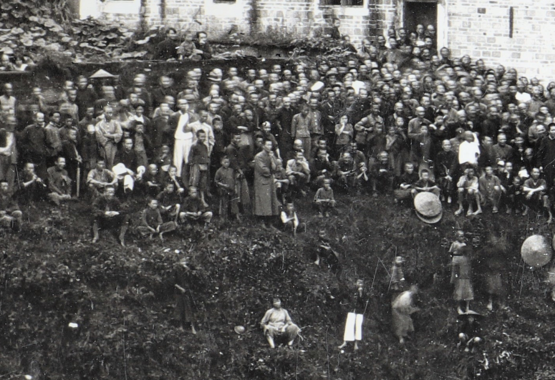 从照片中可以看出,比武现场几乎是人山人海,用里三层外三层都不足以形容盛况,据当时的报道说有二万多人观看。围观人群中有不少人戴斗笠担雨伞,拍摄当天应该为阴雨天气,个别还发挥了飞檐走壁的特长,堡坎上只要站得住脚的地方就有人在上面,更别说站墓碑、爬墙头、上窗台了,外围部分人群还搬来了长凳籍以拔抬自己的高度方便观看。