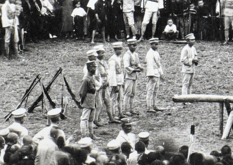 人群中众多持枪士兵间隔排列围出中间空地,用木头木板扎出长形擂台,擂台分为两半,其中一半台面竖四根木头,中间两根拉有横幅,对着青石街方向,由于不是正对着拍摄方向,看不出上面写的是什么。靠近拍摄方向处的一根木头上钉着一木牌,依稀可判别出应该是写着几点比赛规则,但具体什么内容不太分辨得清。擂台上明显看得出两个人,不知道是在过招还是在走动,只是动作比较快,在照片中只有残影恍惚,另一双脚看得出来是打着绑腿。靠堡坎那一面的前排有长椅,坐有年轻人、老人、小孩,画面中可见这周围的人大多在大笑。