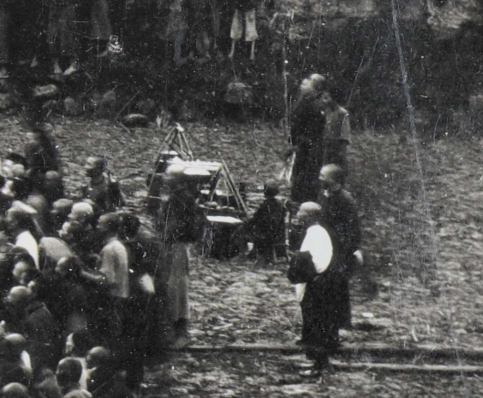 从照片中可以看出,比武现场几乎是人山人海,用里三层外三层都不足以形容盛况,据当时的报道说有二万多人观看。围观人群中有不少人戴斗笠担雨伞,拍摄当天应该为阴雨天气,个别还发挥了飞檐走壁的特长,堡坎上只要站得住脚的地方就有人在上面,更别说站墓碑、爬墙头、上窗台了,外围部分人群还搬来了长凳籍以拔抬自己的高度方便观看。